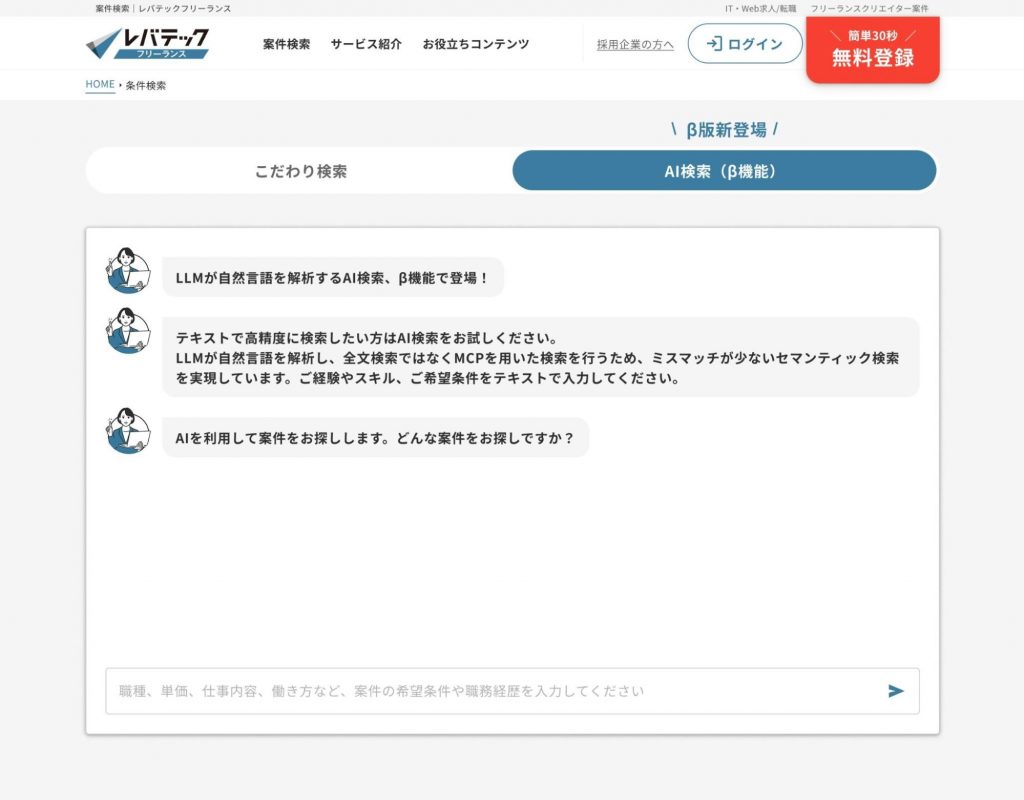 レバテックフリーランス、会話形式で希望案件を探せる 「AIチャット案件検索(β版)」を提供開始
